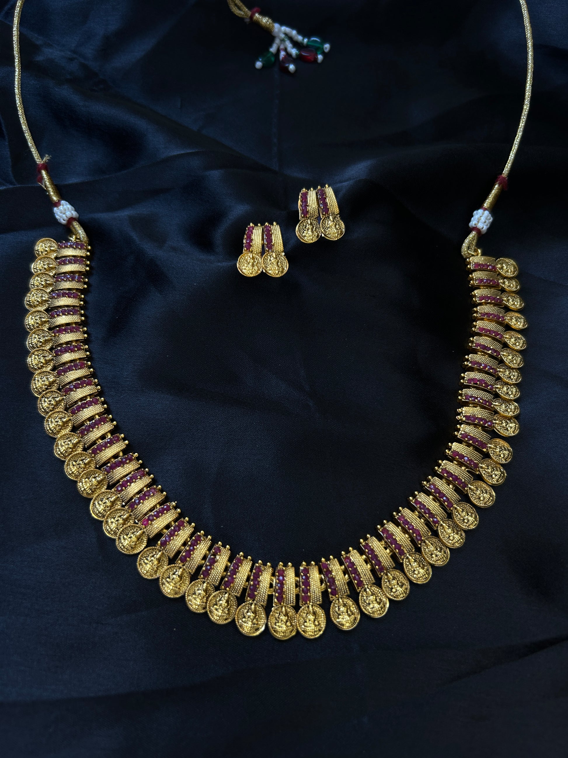 KasuMala Red is a finely crafted traditional garland, known for its vibrant red hues and intricate design. Perfect for ceremonial occasions, it adds a touch of elegance and cultural significance to your attire. Its durable construction ensures it maintains its beauty throughout extended use. Ideal for those seeking authenticity and quality in festive accessories.